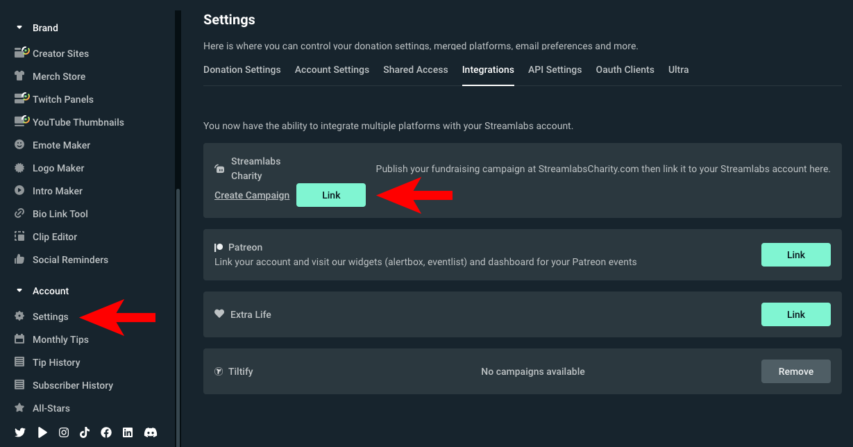 Go to Settings > Integrations and click the "Link" butten under StreamLabs Charity