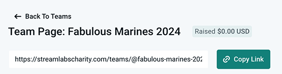 Your sharable donation link can be found at the top of the Teams page . Simply click the green "Copy Link" button.