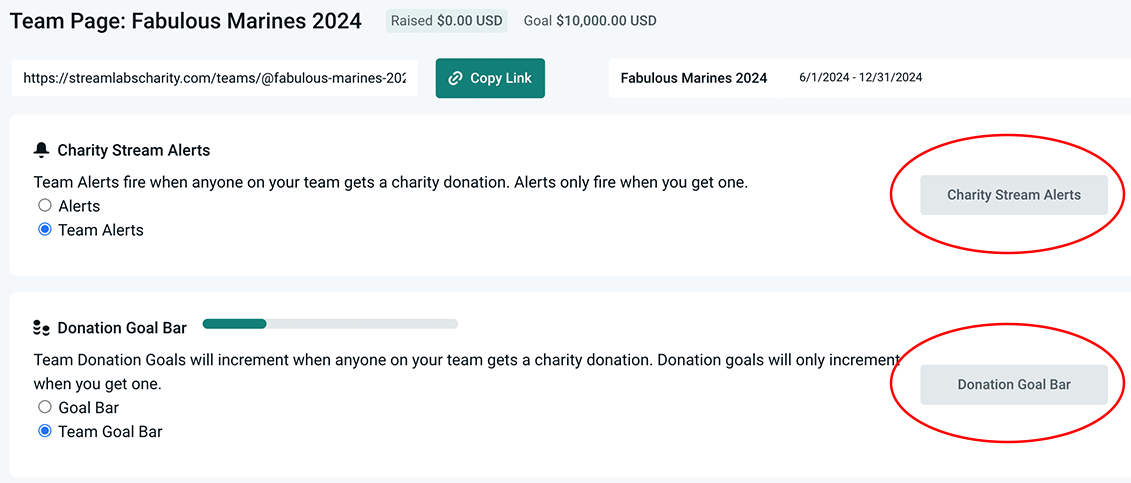 At the top of the Teams page there are two buttons labeled Charity Stream Alerts and Donation Goal Bar - these will each take you to a setup page where you can customize the look for your alerts and/or any donation bars you would like to include on your stream, as well as provide overlay links for you to drop into your Scenes on your broadcasting software of choice.